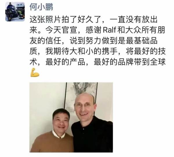 与此同时,小鹏董事长兼CEO何小鹏也发了一条朋友圈,图片是他和内瑞德的合影,并配文说“这张照片拍了好久了,一直没有放出来。今天官宣,感谢Ralf和大众所有朋友的信任,说到努力做到是最基础品质,我期待大和小的携手,将最好的技术,最好的产品,最好的品牌带到全球。” 从照片中能看得出来,何小鹏真的笑得很开心。