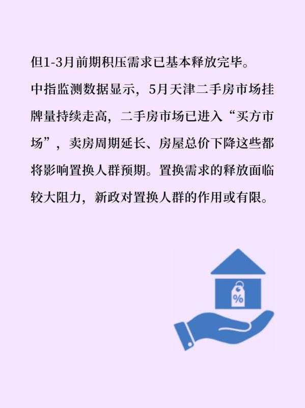 中指监测数据显示,5月天津二手房市场挂牌量持续走高,二手房市场已进入“买方市场”,卖房周期延长、房屋总价下降这些都将影响置换人群预期。置换需求的释放面临较大阻力,新政对置换人群的作用或有限。