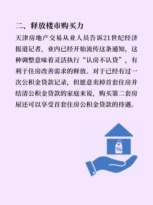 天津房地产交易从业人员告诉21世纪经济报道记者,业内已经开始流传这条通知,这种调整意味着灵活执行“认房不认贷”,有利于住房改善需求的释放。对于已经有过一次公积金贷款记录,但愿意卖掉首套住房并结清公积金贷款的家庭来说,购买第二套房屋还可以享受首套住房公积金贷款的待遇。