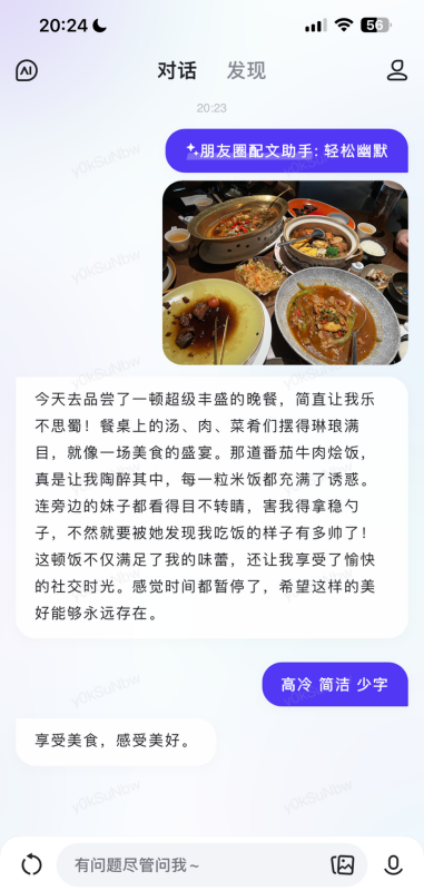 好家伙,这一通浮夸的文案把我给震惊了,这配文简直是放飞自我了。不敢想象如果我把这篇文案发送到朋友圈,身边的人该怎么看我,吓得我只好告诉它请保持:高冷、简洁、少字。它也读懂了我的难为情,回了我八个字:享受美食、感受美好。妙哉妙哉!