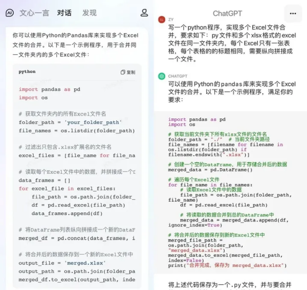 这里提了一个编写合并Excel文件的python代码需求,文心一言整体写得还算比较简洁优雅,回答质量和ChatGPT并没有太大的差距,属于还算是可以用的水平。(这里就不和GPT4进行比较了,肯定还是有些差距的)
