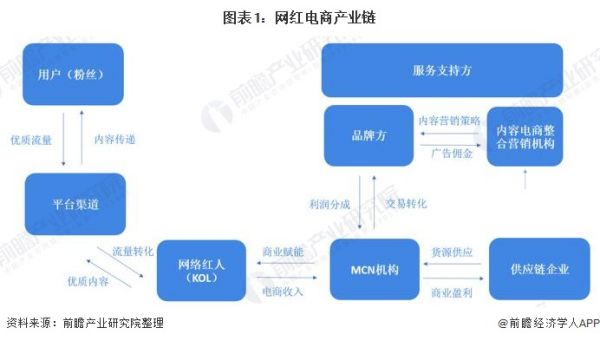 网红电商是指具备网络影响力的内容生产者(网络红人)通过电商平台为用户(粉丝)推荐或售卖产品,即利用互联网将自身流量变现的一种商业模式。目前,我国网红电商已经形成了完整的产业链,包括网红、MCN机构、内容电商整合营销机构、平台渠道、供应链企业和品牌方等。