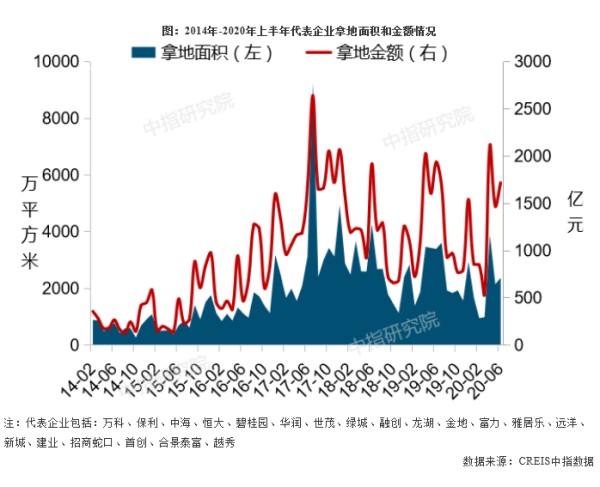 企业拿地力度下降,二季度拿地积极性明显回升。2020年上半年,20家品牌房企累计拿地12063万平方米,同比下降26.5%;累计拿地金额7547亿元,同比下降11.0%。具体来看,一季度受疫情影响,部分城市推地节奏放缓或暂停,企业拿地规模明显下降;4月以来,在市场置业信心逐渐恢复、各地优质地块推出量增加以及资金面略有改善等因素影响下,20家品牌房企调整拿地节奏,拿地积极性明显提升,二季度代表企业拿地金额、面积环比增幅均翻番。
