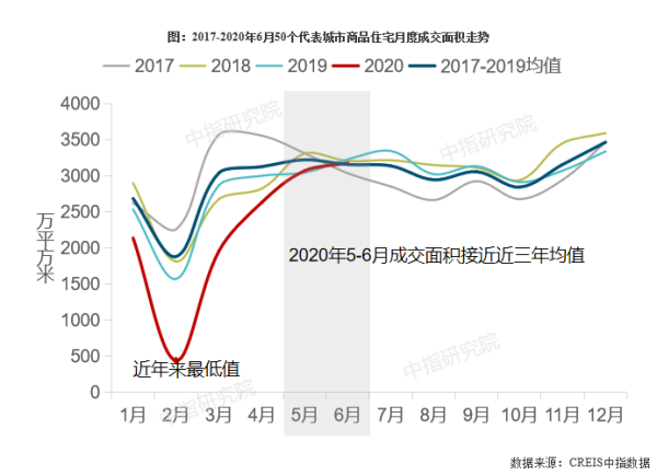 上半年重点城市新房成交面积同比回落,绝对规模为2015年以来同期最低;3月以来市场逐渐恢复,5-6月成交面积已接近近三年同期平均水平。据中指数据初步统计,2020年上半年50个代表城市新建商品住宅月均成交面积在2240万平方米左右,同比下降15%左右,成交规模为2015年以来同期最低水平。3月以来,国内疫情得到有效控制,在各地灵活因城施策、企业积极营销、降息促使购房成本下降等多个因素综合作用下,房地产市场逐渐恢复;5月50个代表城市商品住宅成交面积同比年内首次转正,6月略高于近三年同期平均水平。