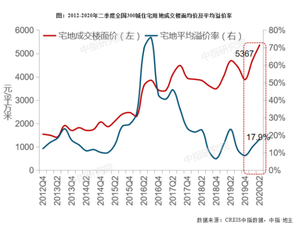 住宅用地成交楼面价达近年来同期最高水平,同比上涨明显。2020年上半年,全国300城住宅用地成交楼面均价为5154元/平方米,为近年来同期最高水平,同比上涨16.5%。300城住宅用地成交楼面均价的上涨,主要受各线城市土地成交结构性因素影响,同时部分热点城市优质地块集中入市,多宗高溢价地块成交,亦推动整体宅地成交楼面均价上涨。溢价率方面,上半年全国300城住宅用地平均溢价率为16.5%。今年一、二季度住宅用地成交楼面均价和溢价率均持续上涨,其中二季度宅地成交楼面均价为5367元/平方米,为近年来季度最高值,同比上涨14.3%;溢价率为17.9%。