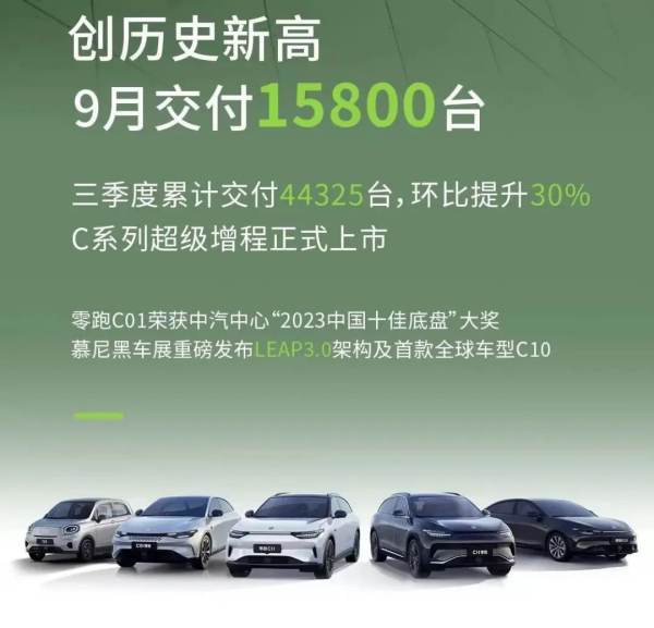 今年9月份,零跑汽车交出的交付量成绩单为15800辆,环比增长11.3%、同比增长43.1%,之所以有如此大的增幅,主要是因为在9月中下旬,零跑推出了新款零跑C01增程版和新款零跑C11增程版。