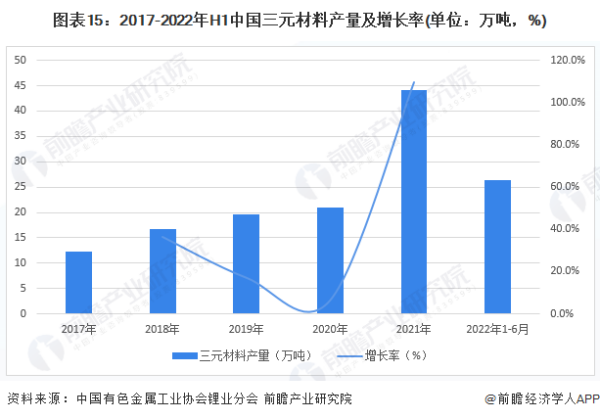 三元材料优势主要体现在比容量高、循环性能好、制备成本低和安全性能较好等方面,由于三元材料的这些优势使其成为最有希望取代钴酸锂的新一代锂离子电池正极材料。2017-2021年,我国三元材料产量呈上升趋势。2021年,我国三元材料产量为44.05万吨,同比上升109.8%。2022年1-6月,中国磷酸铁锂产量为26.38万吨。