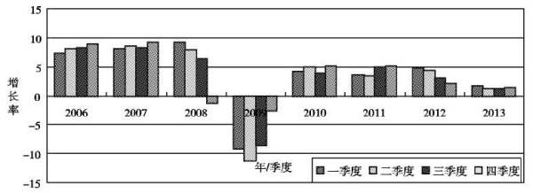 2012年,总统选举尘埃落定,普京竞选期间提出的改革目标开始实施,梅德韦杰夫总理也明确了新政府工作的优先方向,全面改革、结构调整、快速增长已蓄势待发。然而,2012年下半年以来,俄经济却持续下滑,前三季度GDP增长率分别为4.8%、4.3%和3.0%,而第四季度的增长率仅为2.1%,全年增长率为3.4%。进入2013年,经济下滑进一步加剧,前三季度的增长率分别为1.6%、1.2%和1.2%,年GDP增长率仅为1.3%。