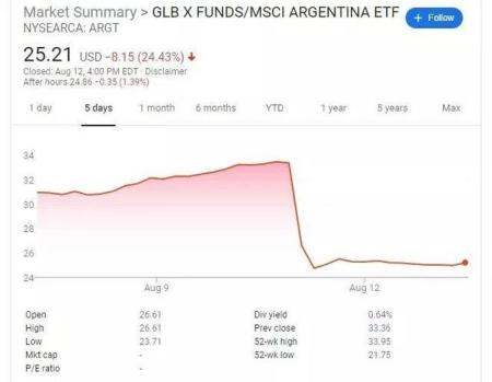 股票市场集体雪崩,主要股指暴跌38%,阿根廷在美股上市企业集体暴跌,其中EDN跌59.3%、LomaNegra跌57.3%、BBVA银行跌55.85%。