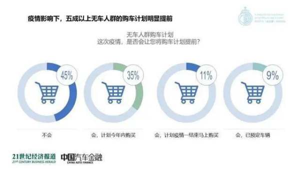 调查显示,受疫情影响,半数以上无车人群的购车计划明显提前;六成有车人群的新增/换购车计划保持不变,1/4人群选择将计划延后等。