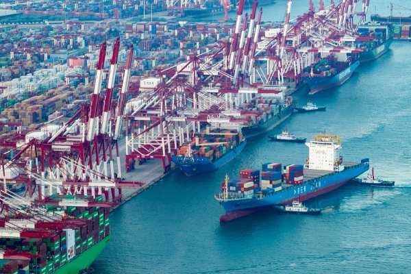 12日,青岛港前湾集装箱码头车船如织、船舶高效频靠频出。
