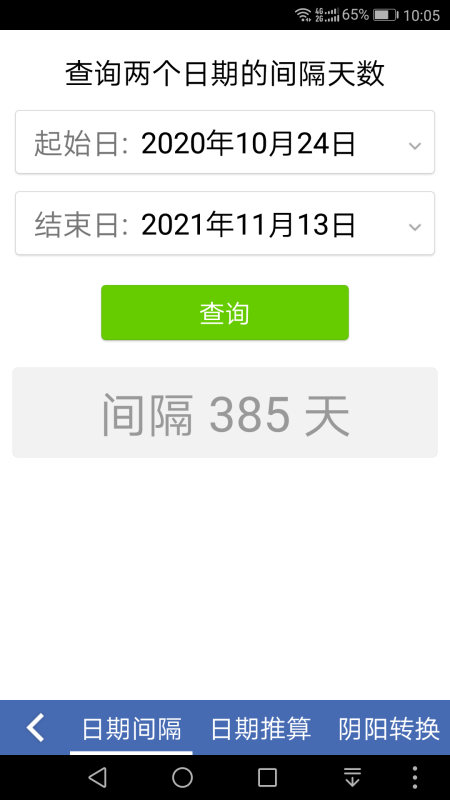 从2020年10月24日到今天(2021年11月13日)一共间隔了 385天,如果算上今天,那就是386天