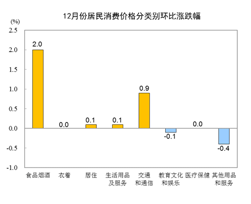 12月份,全国居民消费价格环比上涨0.7%。其中,城市上涨0.7%,农村上涨0.9%;食品价格上涨2.8%,非食品价格上涨0.1%;消费品价格上涨1.2%,服务价格持平。