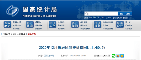 1月11日,国家统计局发布12月份CPI数据显示,2020年12月份,全国居民消费价格同比上涨0.2%。至此,2020年全年全国居民消费价格比上年上涨2.5%。