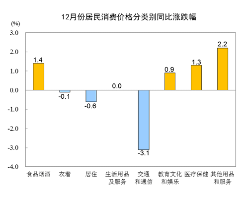 食品中,受持续低温天气影响,鲜菜、鲜果的生产和储运成本增加,价格分别上涨8.5%和3.5%;随着元旦春节到来,消费需求季节性增加,同时饲料成本有所上升,猪肉价格由上月下降6.5%转为上涨6.5%,羊肉价格由上月持平转为上涨2.6%,鸡蛋价格由上月下降1.6%转为上涨2.9%。非食品价格由上月下降0.1%转为上涨0.1%,影响CPI上涨约0.11个百分点。非食品中,受国际原油价格波动影响,汽油、柴油和液化石油气价格分别上涨5.2%、5.8%和3.0%,合计影响CPI上涨约0.10个百分点。