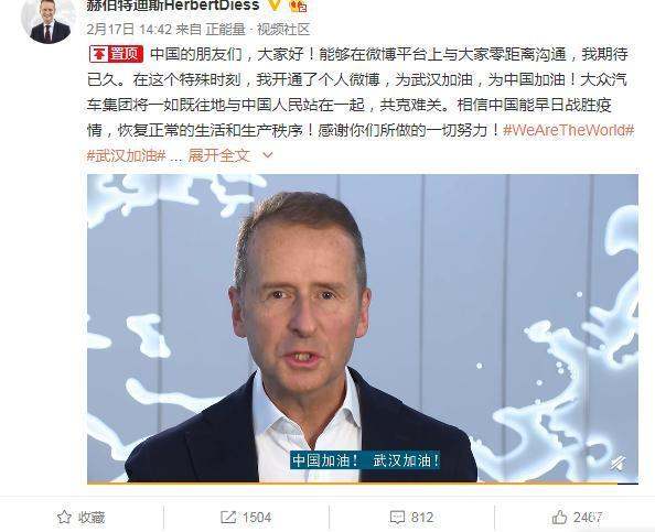 前不久,大众汽车集团管理董事会主席赫伯特迪斯(HerbertDiess)正式开通了个人微博,在目前这个不能开展任何线下活动,只能通过线上发声的特殊背景下,迪斯微博开通,并且表示:中国加油,武汉加油。此外,下方的留言就厉害,有人呼吁汽车质量简配,还有人希望转发抽奖的。