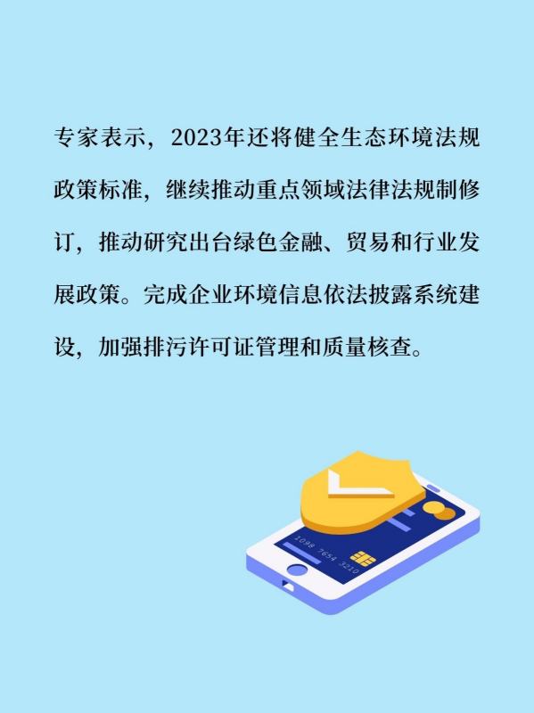 专家表示,2023年还将健全生态环境法规政策标准,继续推动重点领域法律法规制修订,推动研究出台绿色金融、贸易和行业发展政策。完成企业环境信息依法披露系统建设,加强排污许可证管理和质量核查。