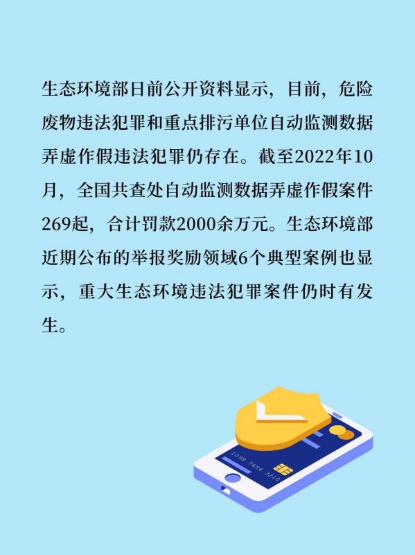 生态环境部日前公开资料显示,目前,危险废物违法犯罪和重点排污单位自动监测数据弄虚作假违法犯罪仍存在。截至2022年10月,全国共查处自动监测数据弄虚作假案件269起,合计罚款2000余万元。生态环境部近期公布的举报奖励领域6个典型案例也显示,重大生态环境违法犯罪案件仍时有发生。