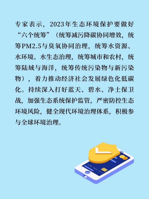 专家表示,2023年生态环境保护要做好“六个统筹”(统筹减污降碳协同增效,统筹PM2.5与臭氧协同治理,统筹水资源、水环境、水生态治理,统筹城市和农村,统筹陆域与海洋,统筹传统污染物与新污染物),着力推动经济社会发展绿色化低碳化。持续深入打好蓝天、碧水、净土保卫战,加强生态系统保护监管,严密防控生态环境风险,健全现代环境治理体系,积极参与全球环境治理。