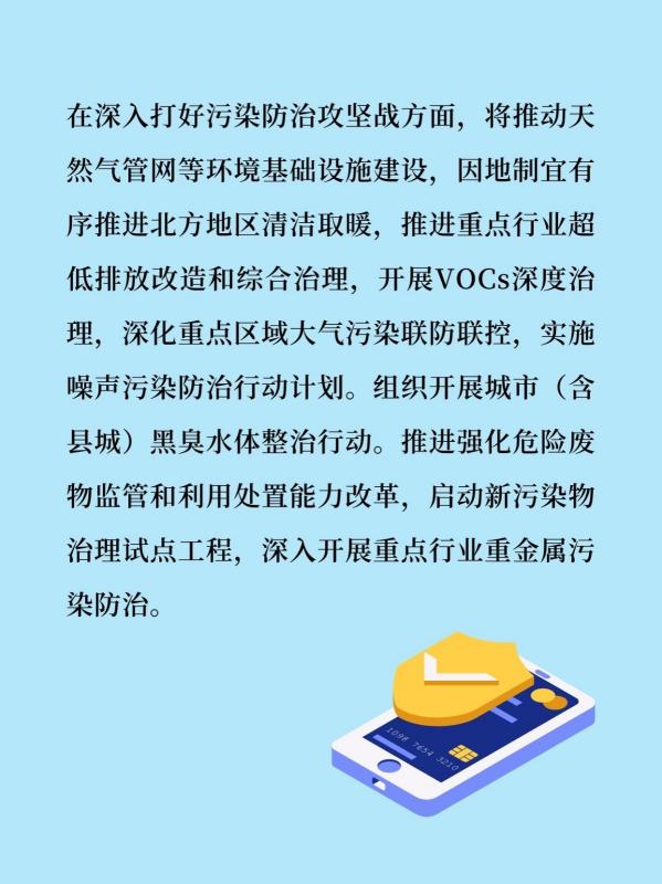 在深入打好污染防治攻坚战方面,将推动天然气管网等环境基础设施建设,因地制宜有序推进北方地区清洁取暖,推进重点行业超低排放改造和综合治理,开展VOCs深度治理,深化重点区域大气污染联防联控,实施噪声污染防治行动计划。组织开展城市(含县城)黑臭水体整治行动。推进强化危险废物监管和利用处置能力改革,启动新污染物治理试点工程,深入开展重点行业重金属污染防治。