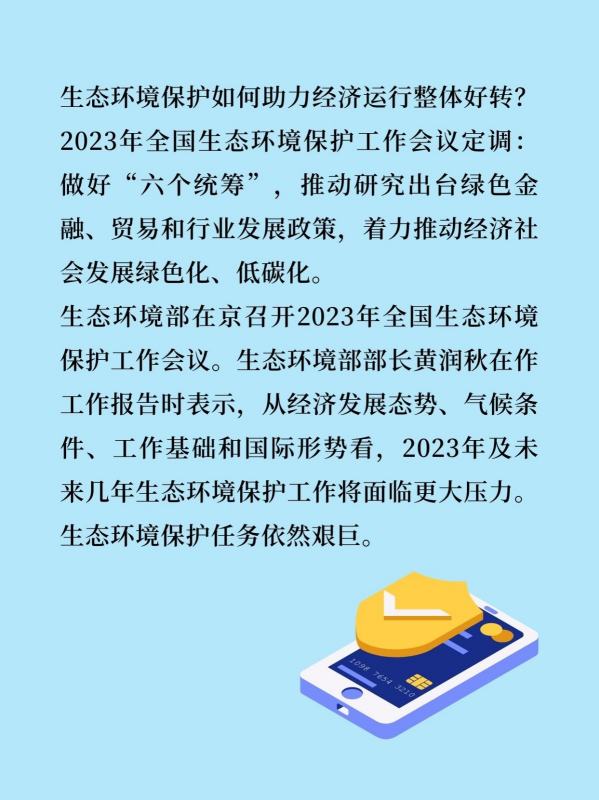 生态环境保护如何助力经济运行整体好转?2023年全国生态环境保护工作会议定调:做好“六个统筹”,推动研究出台绿色金融、贸易和行业发展政策,着力推动经济社会发展绿色化、低碳化。