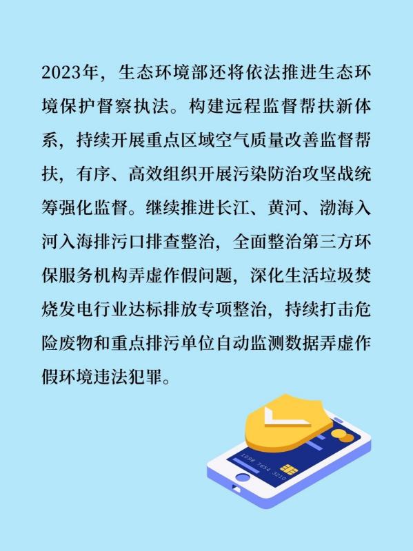 2023年,生态环境部还将依法推进生态环境保护督察执法。构建远程监督帮扶新体系,持续开展重点区域空气质量改善监督帮扶,有序、高效组织开展污染防治攻坚战统筹强化监督。继续推进长江、黄河、渤海入河入海排污口排查整治,全面整治第三方环保服务机构弄虚作假问题,深化生活垃圾焚烧发电行业达标排放专项整治,持续打击危险废物和重点排污单位自动监测数据弄虚作假环境违法犯罪。