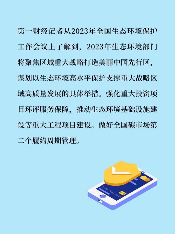 第一财经记者从2023年全国生态环境保护工作会议上了解到,2023年生态环境部门将聚焦区域重大战略打造美丽中国先行区,谋划以生态环境高水平保护支撑重大战略区域高质量发展的具体举措。强化重大投资项目环评服务保障,推动生态环境基础设施建设等重大工程项目建设。做好全国碳市场第二个履约周期管理。