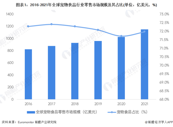 根据Euromonitor公布的数据,2021年全球宠物食品行业零售市场规模达1149.42亿美元,同比增长11.99%,近5年全球宠物食品行业零售市场规模复合增长率达6.92%。