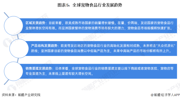 从区域发展趋势来看,欧美国家的宠物食品行业整体增长空间有限,而亚洲国家的宠物消费市场极具潜力;从产品结构发展趋势来看,欧美国家未来将走“大众优质化”路线,亚洲国家的中高端产品市场份额将有所上升;从销售渠道发展趋势来看,未来线上渠道有较大增长空间。