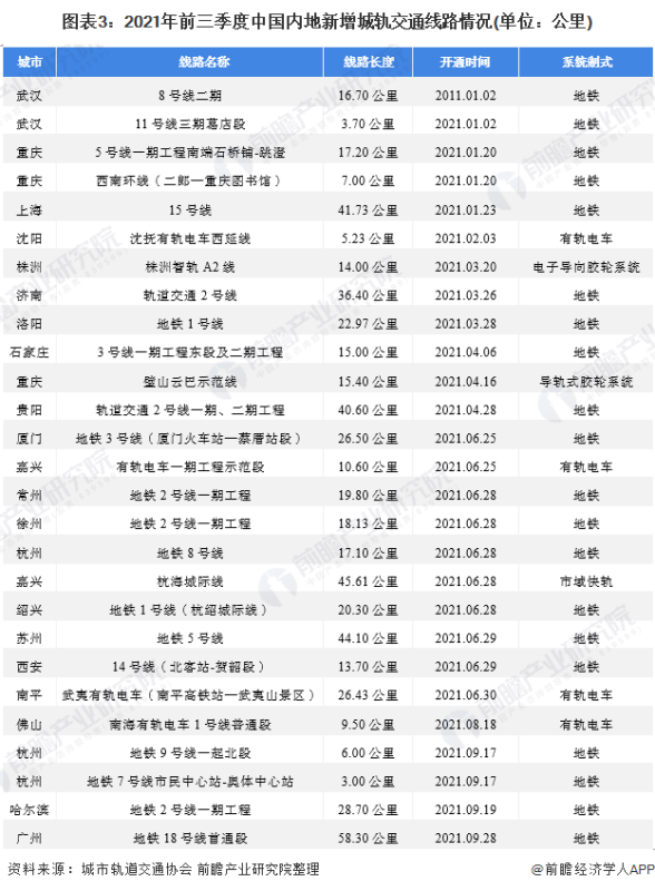 1、 2021年前三季度新增线路21条,共计新增运营线路长度583.70公里