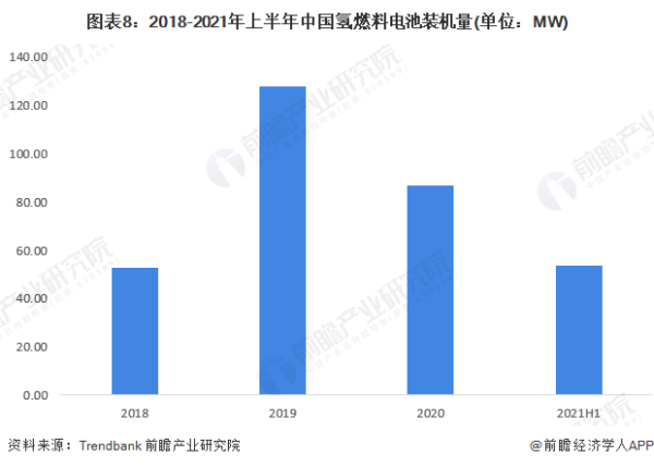 2018-2020年,中国氢燃料电池装机量呈波动下降态势。从装机功率来看,2019年是中国氢燃料电池行业发展较好的一年,政府为发展新能源行业而出台一系列补贴政策进行鼓励和扶持;2020年,受疫情和补贴退坡的影响,中国燃料电池装机量仅为87MW,其中约80MW使用在氢燃料电池汽车领域。目前,氢燃料电池行业仍处于复苏时期,2021年上半年装机量超过50MW。