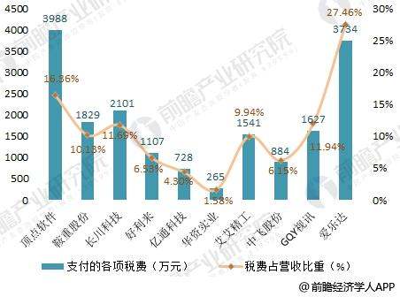2017年,在选取的10家上市公司中,顶点软件支付的各项税费用最高,达到3988万元;爱乐达其次,去年支付的各项税费用为3734万元;最少的是华资实业,只有265万元。从占营收比重来看,爱乐达支付的各项税费用占比最大,2017年为27.46%,顶点软件、鞍重股份、长川科技、GQY视讯比重也超过10%。