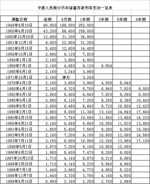 历年存款利率表1990至2021