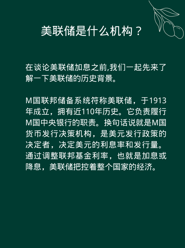 M国联邦储备系统符称美联储,于1913年成立,拥有近110年历史。它负责履行M国中央银行的职责。换句话说就是M国货币发行决策机构,是美元发行政策的决定者,决定美元的利息率和发行量。通过调整联邦基金利率,也就是加息或降息,美联储把控着整个国家的经济。
