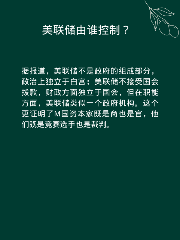 据报道,美联储不是政 府的组成部分,政 治上独立于白宫;美联储不接受国会拨款,财政方面独立于国会,但在职能方面,美联储类似一个政 府机构。这个更证明了M国资本家既是商也是官,他们既是竞赛选手也是裁判。