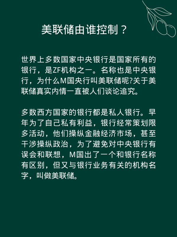 多数西方国家的银行都是私人银行。早年为了自己私有利益,银行经常策划限多活动,他们操纵金融经济市场,甚至干涉操纵政治,为了避免对中央银行有误会和联想,M国出了一个和银行名称有区别,但又与银行业务有关的机构名字,叫做美联储。
