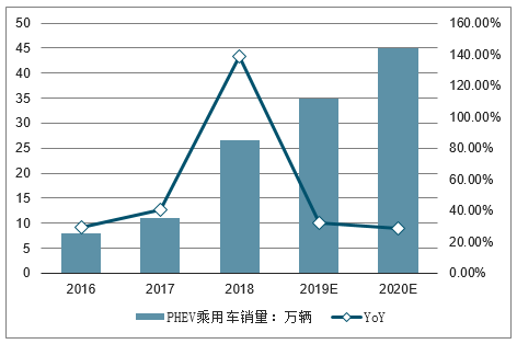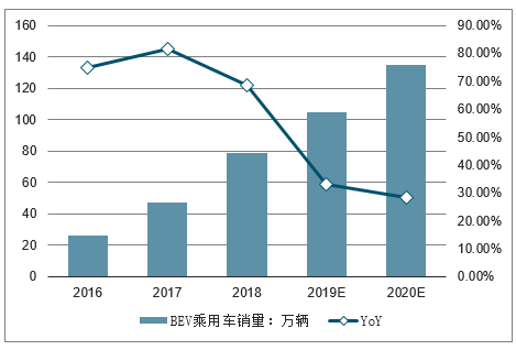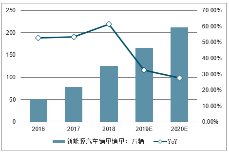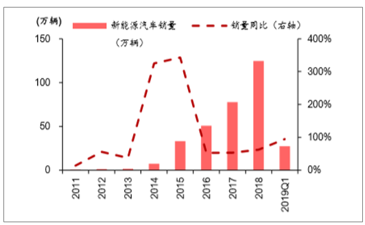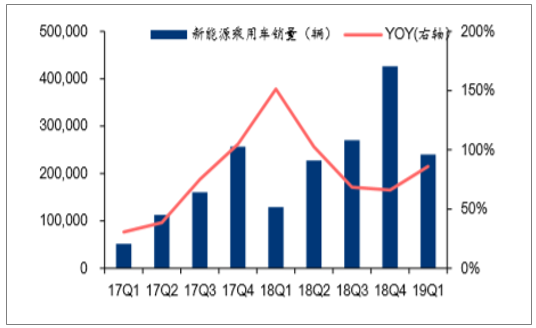 新能源乘用车强势增长,过渡期冲量有望新能源乘用车发力,新能源汽车销量保持较快增速。2018年,新能源汽车销量为124.73万辆,同比增速为62.46%。新能源汽车销量领先的主要原因是新能源乘用车销量强势增长,尤其是插电混动车型销量超预期。2019年Q1,新能源汽车销量27.42万辆,同比+95%;其中新能源乘用车销量25.23万辆,同比+97.9%。虽然补贴下降超过此前预期,但是新能源乘用车因为限购限牌,产品力提升,双积分政策增加供给等原因仍有望保持较快增长,预计全年新能源乘用车销量140万辆,同比+33%,新能源汽车销量166万辆,同比+32.5%。