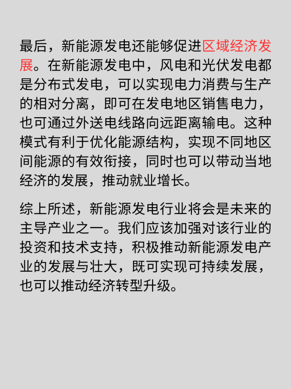 综上所述,新能源发电行业将会是未来的主导产业之一。我们应该加强对该行业的投资和技术支持,积极推动新能源发电产业的发展与壮大,既可实现可持续发展,也可以推动经济转型升级。