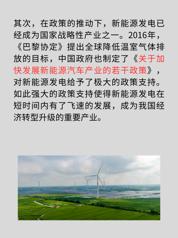 其次,在政策的推动下,新能源发电已经成为国家战略性产业之一。2016年,《巴黎协定》提出全球降低温室气体排放的目标,中国政府也制定了《关于加快发展新能源汽车产业的若干政策》,对新能源发电给予了极大的政策支持。如此强大的政策支持使得新能源发电在短时间内有了飞速的发展,成为我国经济转型升级的重要产业。