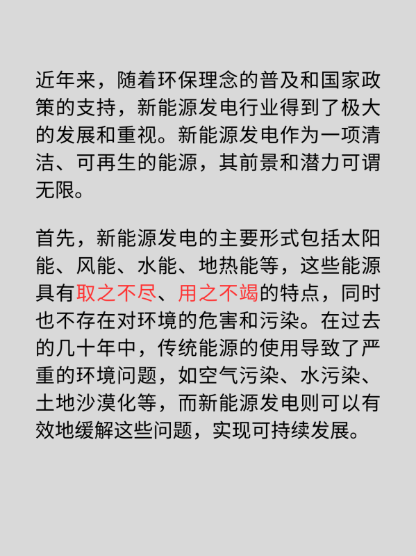 首先,新能源发电的主要形式包括太阳能、风能、水能、地热能等,这些能源具有取之不尽、用之不竭的特点,同时也不存在对环境的危害和污染。在过去的几十年中,传统能源的使用导致了严重的环境问题,如空气污染、水污染、土地沙漠化等,而新能源发电则可以有效地缓解这些问题,实现可持续发展。