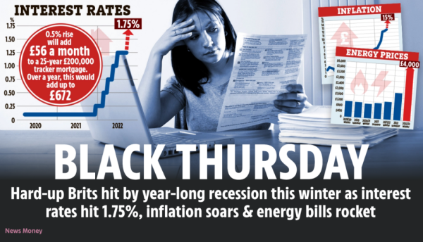 随着英国能源危机的恶化,通货膨胀的持续上涨已经有点“刹不住车”的迹象,英国央行将会收紧货币政策,而这又加剧了对经济下滑的担心。