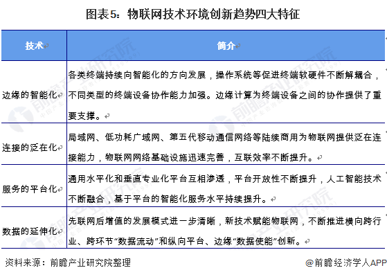 区块链、边缘计算、人工智能等新技术题材不断注入物联网,为物联网带来新的创新活力。受技术和产业成熟度的综合驱动,物联网呈现“边缘的智能化、连接的泛在化、服务的平台化、数据的延伸化”等特点。