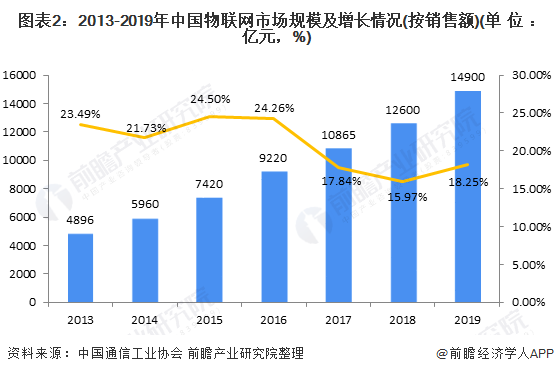 自2013年以来我国物联网行业规模保持高速增长,增速一直维持在15%以上,江苏、浙江、广东省行业规模均超千亿元。中国通信工业协会的数据表明,随着物联网信息处理和应用服务等产业的发展,中国物联网行业规模已经从2013年的4896亿元增长至2019年的1.5万亿元。
