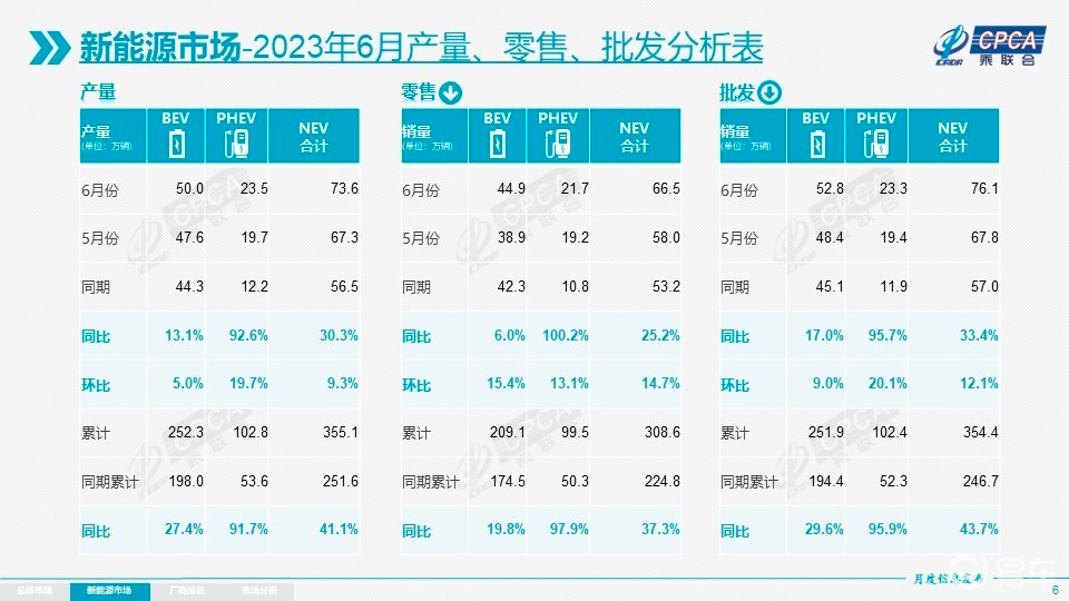 新能源车市场,可以看到,2023年6月单月纯电动车和插电混动车型累计零售销量为66.5万辆,相比去年同期的53.2万辆增长25.2%,环比增长14.7%。今年上半年,我国新能源车累计半年度零售销量达308.6万辆,同比去年大幅度增长37.3%。