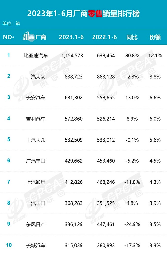 6月,比亚迪汽车单月销量231230辆,相比2022年同期实现近乎翻倍增长。长安汽车、吉利汽车两大头部国产品牌,也有着不错的业绩表现。