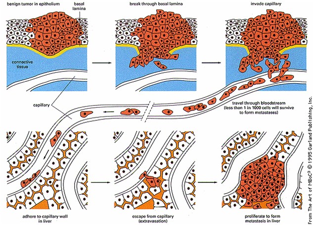 3、容易转移:癌细胞与其同源正常组织相比,细胞间的粘着性降低,故癌细胞在体内容易分散和转移。在正常细胞外被中的纤粘连蛋白是一种细胞外粘着糖蛋白,它增强了细胞与细胞外基质间的粘着。癌细胞的纤连粘蛋白显著减少或缺失,钙粘蛋白合成发生障碍,从而破坏了细胞与基质之间和细胞与细胞之间的粘着,因此癌细胞具有易于侵润组织和转移的属性。