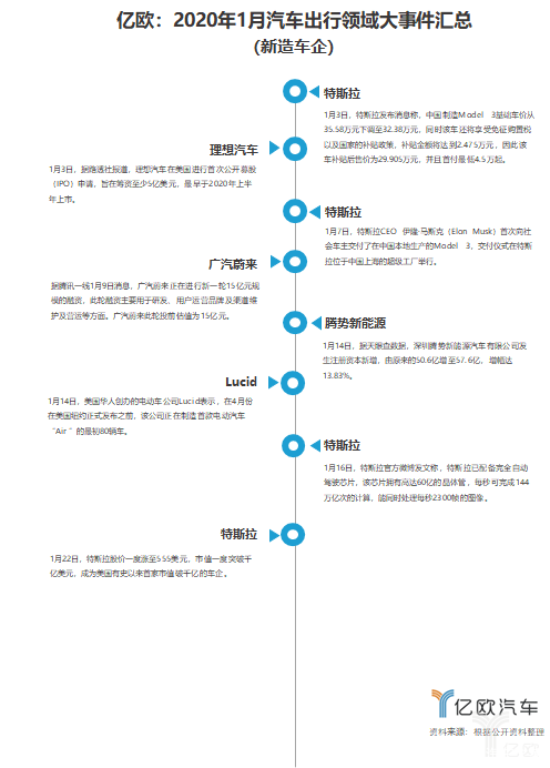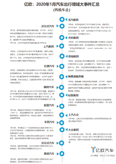 为方便大家了解、回顾1月汽车出行产业发生的大事件,亿欧汽车按照传统车企、新造车企和科技企业等不同类别,对当月大事进行了整理。