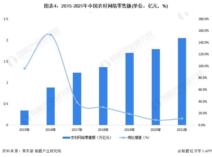 电子商务加速赋能农村产业化、数字化发展,有力推动脱贫攻坚和乡村振兴。根据商务部数据显示,2021年中国农村网络零售额达到2.05万亿元,同比增长11.3%,农产品网络零售额达到4221亿元,同比增长2.8%。