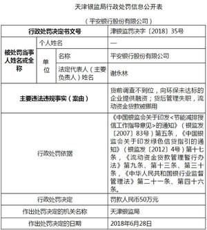 2018年6月28日,平安银行股份有限公司由于贷前调查不到位、向环保未达标的企业提供融资,以及贷后管理失职、流动资金贷款被挪动等案由被天津银监局罚款50万元。
