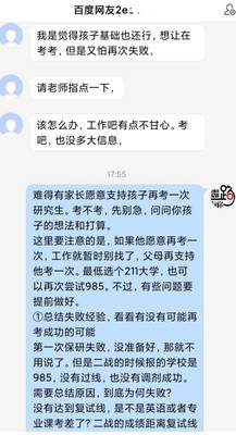 这位家长觉得自己孩子的基础还算不错,在第二次考研的时候复习不到位,功夫没下到,所以再次失败。如果要他的孩子直接工作的话,无论是家长还是考生,都会觉得不甘心。但是再考的话,却没有多大的信心,这才如此纠结!